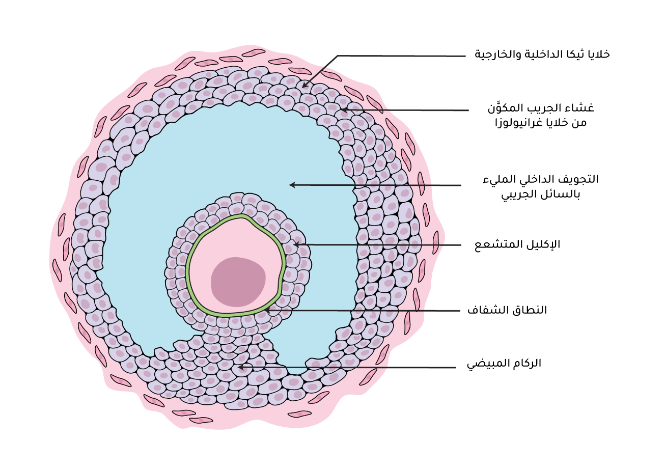 المبيض، ويصل حجم الجُرَيب الناضج إلى 28 ملّيمترًا، وتكون داخله البويضة الناضجة التي يصل قطرها إلى 0.1 ملّيمتر، وذلك يعني أن حجمها يزيد على عشرة أضعاف حجم الخلايا الجسدية في الجسم. وبعد انطلاق البويضة من الجريب الناضج، تنطلق معها مجموعة من الطبقات الخلوية التي كانت جزءًا من مكونات هذا الجريب (الشكل 3)[5]. وترتيب هذه الطبقات من خارج البويضة إلى داخلها كما يلي: