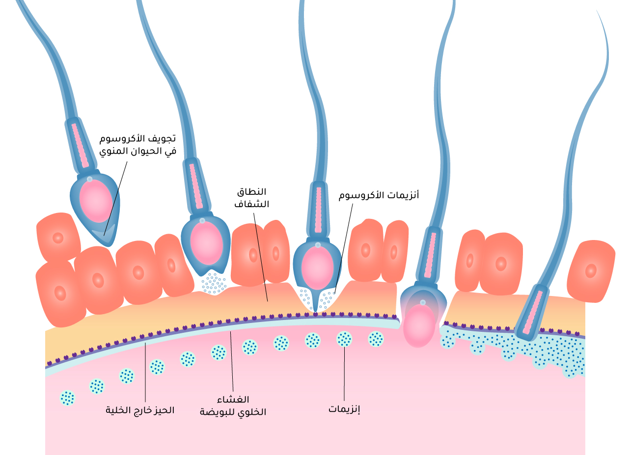 وكما ورد سابقًا، يوجد حول البويضة ثلاث طبقات؛ الأولى، من خارجها، خلوية، وهي الرُّكَام المبيضي، ولكن الخلايا فيها تكون غير متلاصقة، فتستطيع اختراقَها مجموعةٌ من الحيوانات المنوية من دون عناء، ومن ثم تصل هذه الحيوانات إلى الطبقة الثانية، الإكليل المتشعِّع، وهي طبقة خلوية أخرى متراصة وملتصقة ببعضها، فتفرز عليها الحيوانات المنوية من إنزيماتها القوية الموجودة في فجوة الأكروسوم التي توجد في رأس الحيوان المنوي مسببةً تفككها. وتُلحَظ هنا الحاجة إلى أكثر من حيوان منوي لتكون كمية المادة المُفرَزة كافية وفعالة لاختراق هذه الطبقة، إذ إن هذه الحيوانات تعمل بشكل جماعي في بداية اختراقها البويضةَ (الشكل 5)[14].