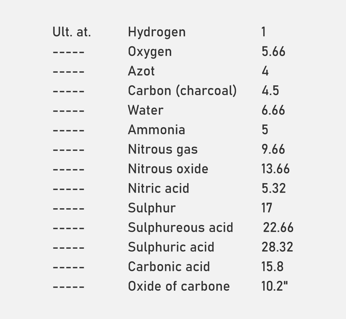 الجدول الأول للأوزان الذرية النسبية للعناصر والمركبات التي وضعها دالتون