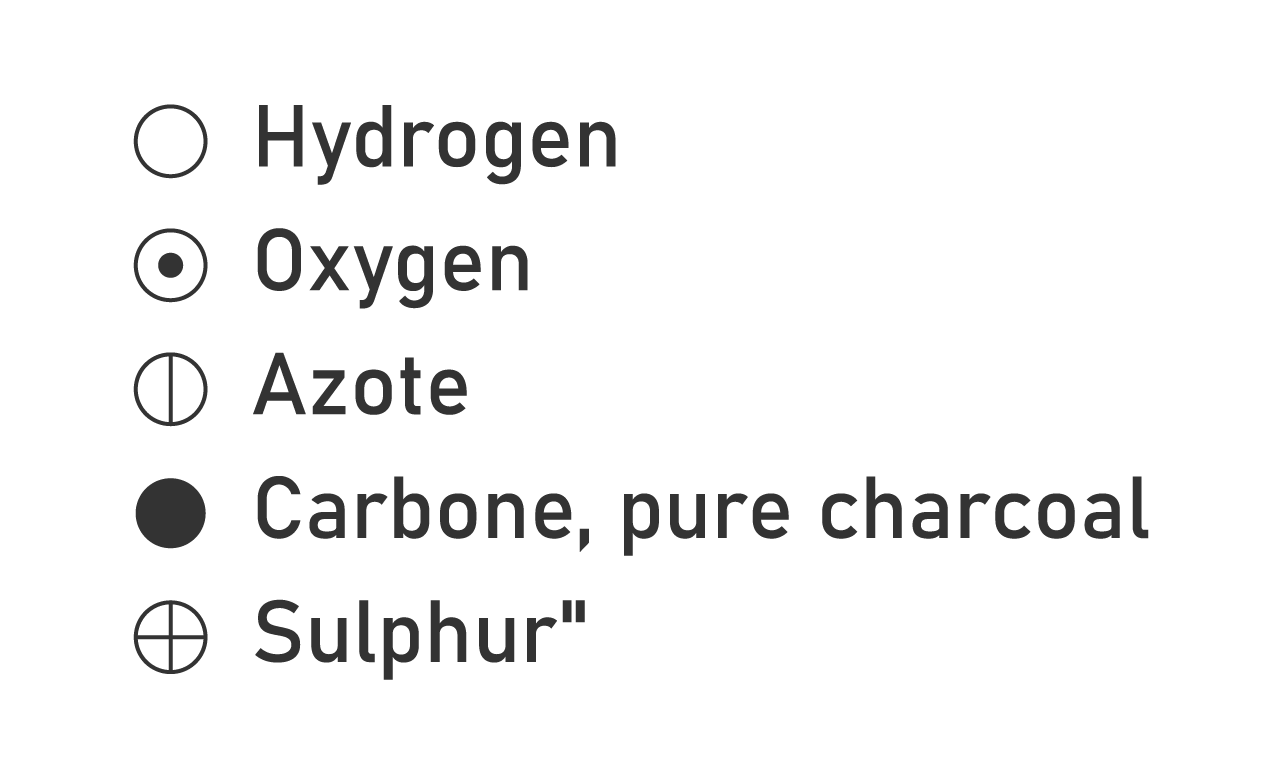 العناصر الهيدروجين والأكسجين والنيتروجين والكربون. وأعطى رموزًا تصويرية لتمثيل هذه