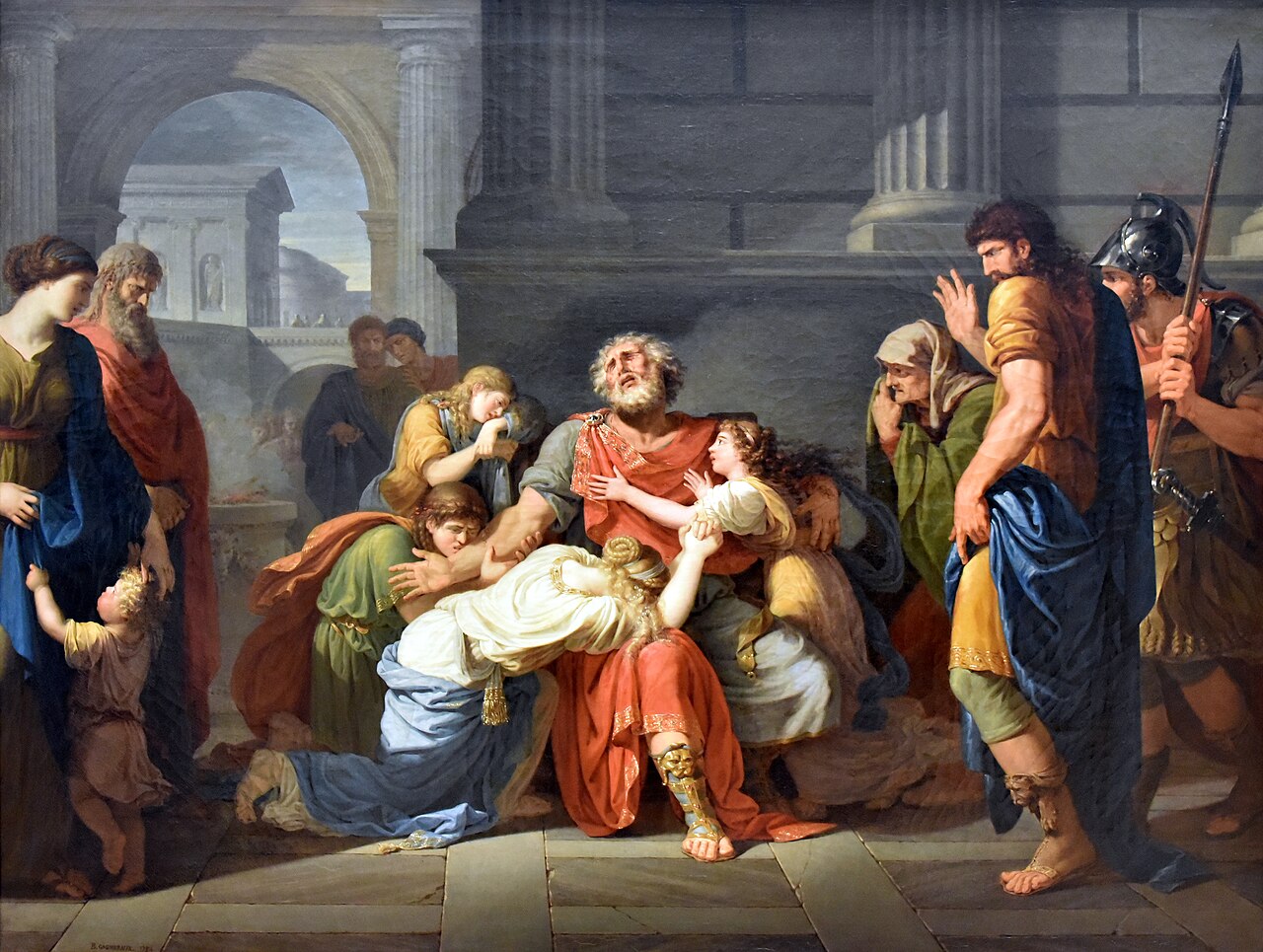 أوديب الملك مخاطبًا الآلهة بعد معرفته للحقيقة في لوحة للفنان الفرنسي من أصول إيطالية (Bénigne Gagneraux) بعنوان "الأعمى أوديب يشيد بأطفاله للآلهة"