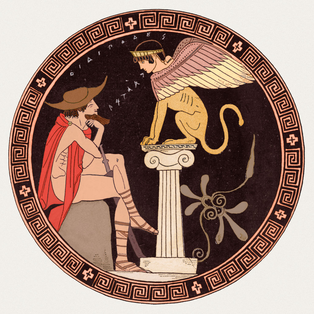 صورة لأوديب يحاور المسخة ويجيب عن لغزها. وجدت اللوحة مرسومة على مزهرية من العصر اليوناني